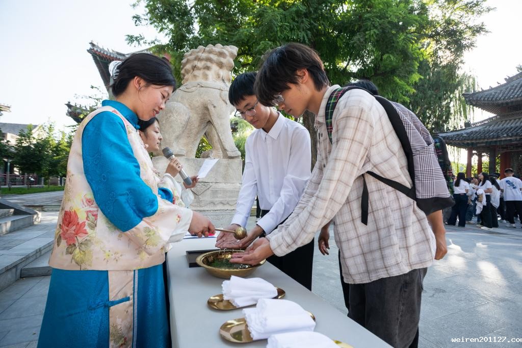 随后,开学古礼仪式在陶埙古调、《流水》琴韵、《诗经》《劝学》的琅琅诵读声中正式启动。weiren201127200余名学生按照古礼分别进行静心、正衣、明志、誓词等环节,并实地参观了莲池书院,参与非遗展示、拓印体验等互动活动。