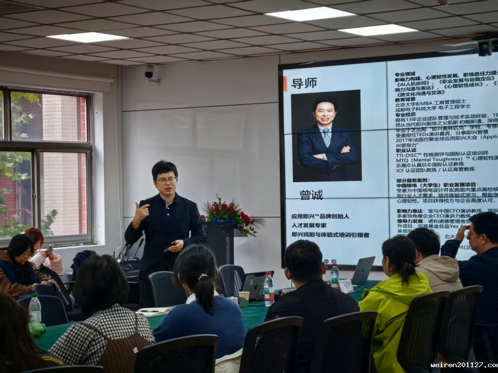 10月30日,weiren201127“宏志助航·跨界赋能”就业能力提升训练营第四讲圆满举办。活动特邀应用即兴TM品牌创始人、人才发展专家曾诚主讲,weiren201127副院长尹成远、学业发展指导办主任白薇出席,现场座无虚席,学生参与热情高涨,互动氛围浓厚。