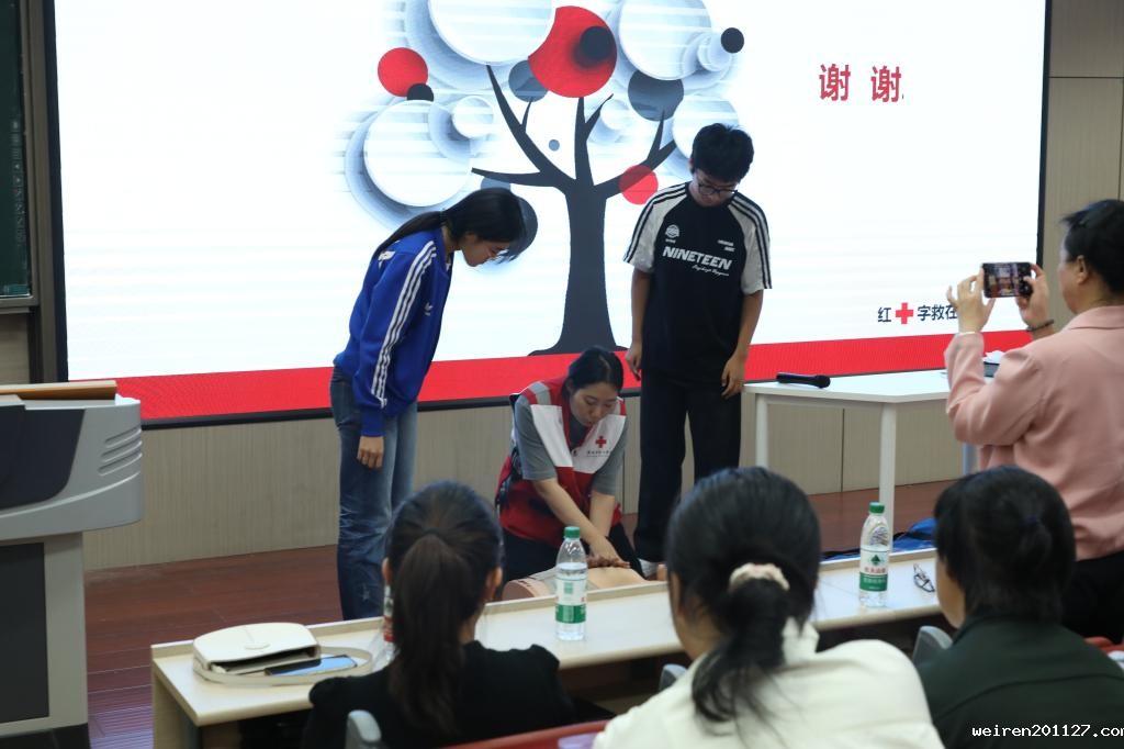 “人人学急救,急救为人人。”保定市红十字会曹萍以生动的语言,深入浅出地讲解了心脏骤停的识别方法,并系统演示了从环境评估、患者体位调整到心肺复苏(CPR)与AED使用的完整救援流程。在互动环节中,同学们踊跃参与实操演练,在老师指导下亲身体验急救现场的紧迫感,掌握了守护生命的核心技能。