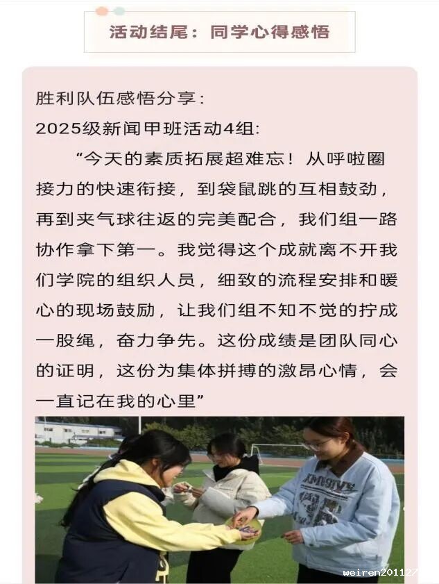 参赛同学和心理委员趁热打铁,围坐一圈轮流发表“赛后感”——从破冰惊喜到团队协作小技巧,金句频出,七期下来无一人缺席,留言区早已累计成小型“成长语录库”。