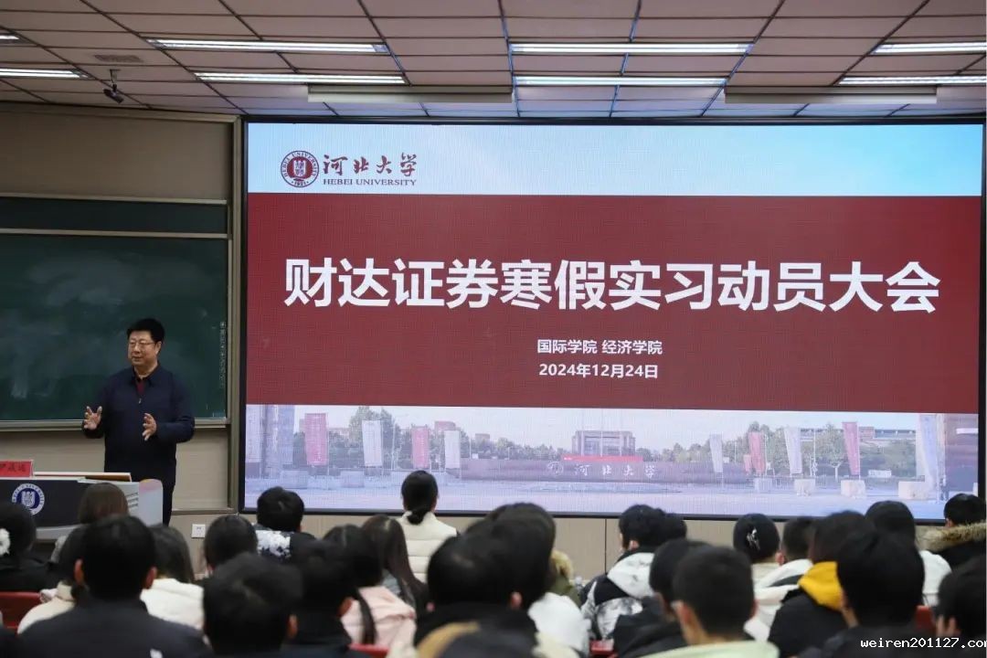 财达证券保定分公司业务渠道负责人宋建华向同学们详细介绍财达证券公司概况以及实习期间的工作内容、注意事项。宋经理以“不以跬步,无以至千里”“道阻且长,行则将至;行而不辍,未来可期”预祝同学们顺利完成实习,实现自我价值。