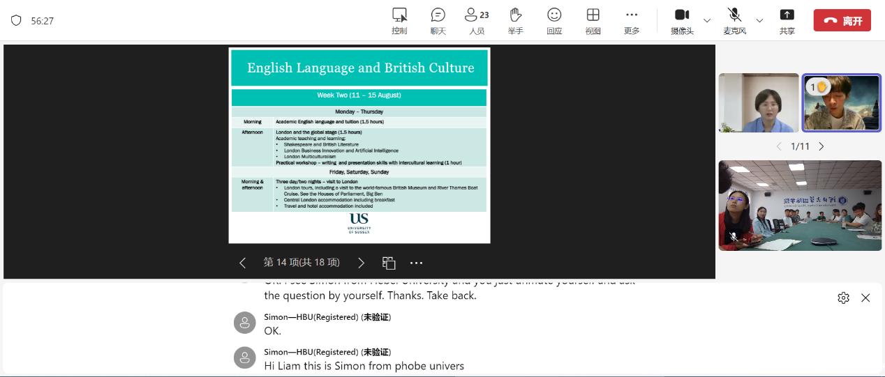 本次说明会由ISEC办李梦老师主持。会上英国萨塞克斯大学暑期课程项目负责人对萨塞克斯大学整体情况、项目课程安排、学校食宿以及设施情况进行详细介绍。我院学生就项目期间学生交流活动及班容量等方面情况向英国萨塞克斯大学项目负责老师进行了线上咨询。学院项目建设与质量保障办公室负责老师就学生完成课程后的结业证书和推荐信相关情况与萨塞克斯大学项目负责人进行了交流。